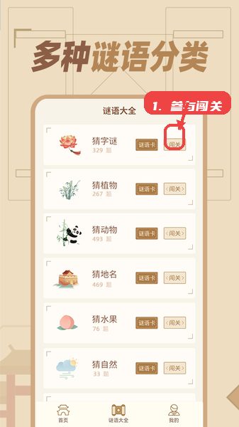 在综合猜谜页面选择分类后,点击页面上方“闯关”入口,进入连续答题模式,遇到困难时可使用提示按钮帮助解谜。