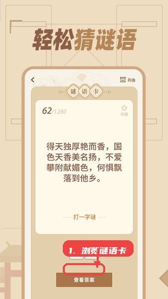 点击底部导航进入谜语卡模块,选择感兴趣的谜题进行解答,使用收藏按钮保存喜欢的条目。