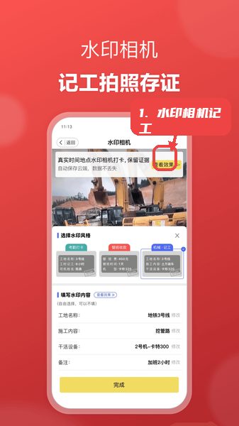 打开水印相机后,调整水印设置,拍照记录工作内容,点击查看效果按钮确认照片样式,再保存使用。