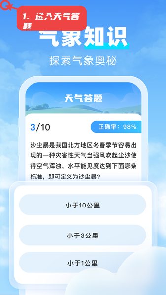 打开应用后,在首页找到“天气答题”入口,点击即可开始一轮气象知识测试。