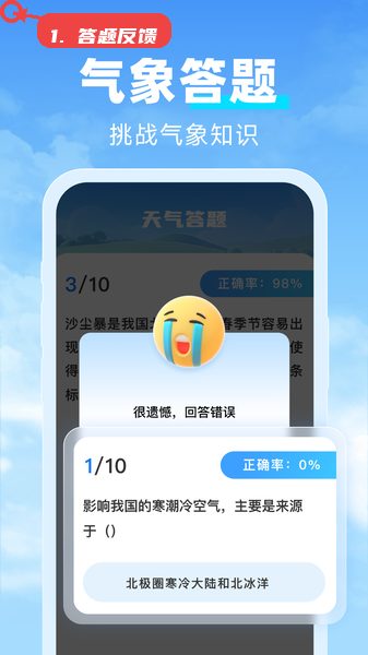 入口位于首页,用户点击后进入答题环节。通过选择题形式测试气象知识,系统会实时统计正确率,并在答题出错时给予反馈,帮助用户发现盲点。