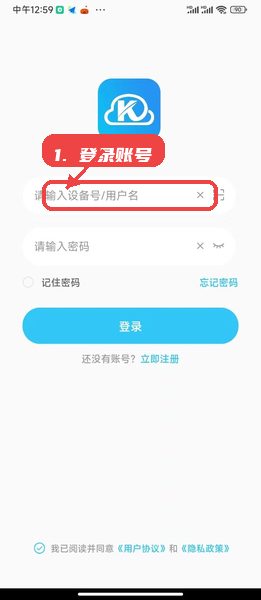 打开应用后,在登录界面输入设备号或用户名进行身份验证,完成登录后进入主界面。