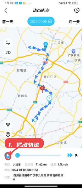 切换到轨迹查询页面,选择需要查看的时间段,通过播放按钮查看设备的动态轨迹动画,回顾行驶路线。