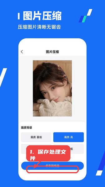 在主界面选择“图片压缩”入口,进入后设定画质等级,根据需求调整图片大小。