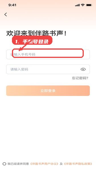 打开应用后,在登录界面输入注册使用的手机号码,并填写密码。完成后点击“立即登录”按钮进入主界面。底部有伴路书声用户协议和隐私政策,用户可根据需要查看。