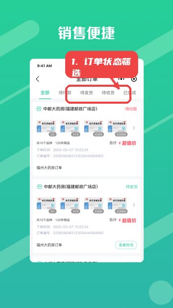 在订单管理页面,点击“待付款”、“待发货”等状态标签,筛选对应订单,方便分类处理和跟踪物流。