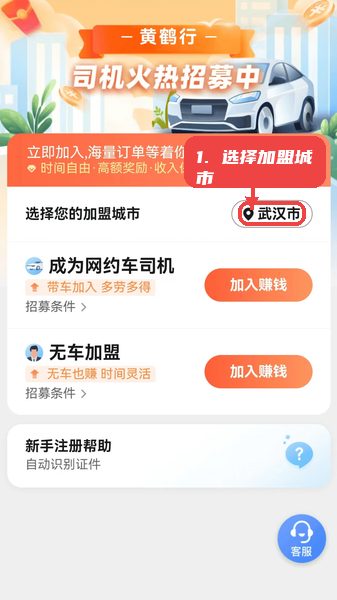 进入司机招募页面后,用户可以点击顶部城市选择入口,默认显示武汉市。确认所在城市后,即可进入对应的加盟选项,适合想要在特定城市开展网约车服务的司机。